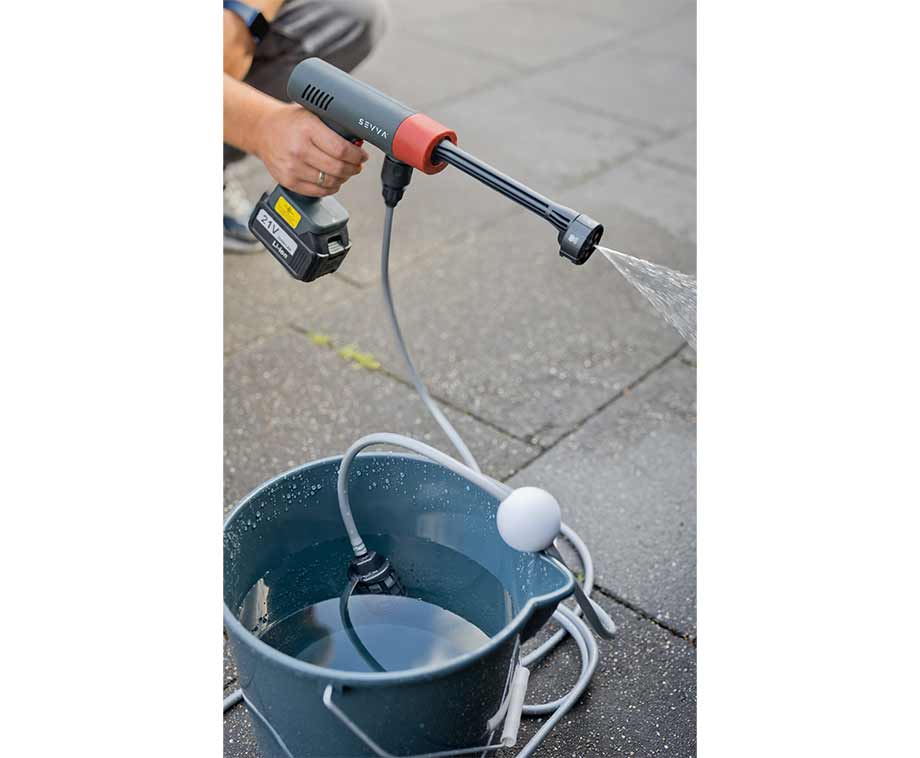 Alles wat nodig is zit in de doos. Een 5 meter waterslang, snelkoppeling en filter maken het mogelijk om water uit diverse bronnen te gebruiken. Ideaal voor gebruik in de tuin, op de oprit of op locatie.